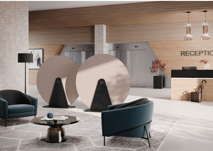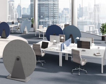 Eine Akustik Disc kann nicht nur dazu eingesetzt werden den Geräuschpegel im Raum zu reduzieren, sondern auch als mobiler Trenner von flexiblen Funktionsbereichen, die Raum für konzentriertes und entspanntes Arbeiten bieten.