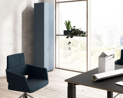 Raumkonzepte, die wenig oder keine Installationen an Wand oder Decke ermöglichen, profitieren von dem Einsatz der Akustiksäule. Durch ihre Stoffbespannung rundum dient sie als effektiver Schallabsorber.