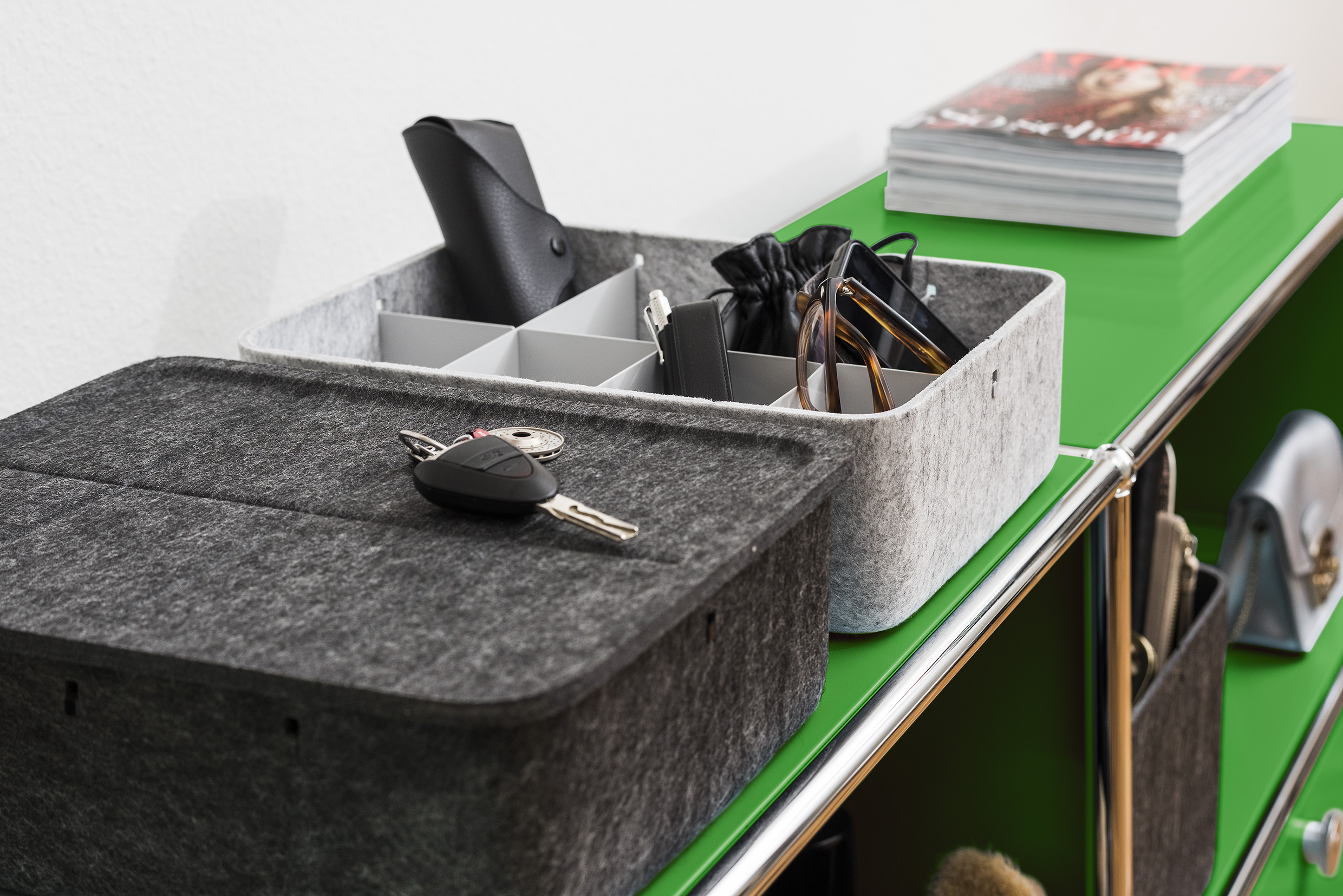 Aber auch das Innenleben lässt sich mit Zubehör ganz nach Ihren Wünschen verbessern mit den praktischen Inos Boxen und Kastensets von USM Haller.